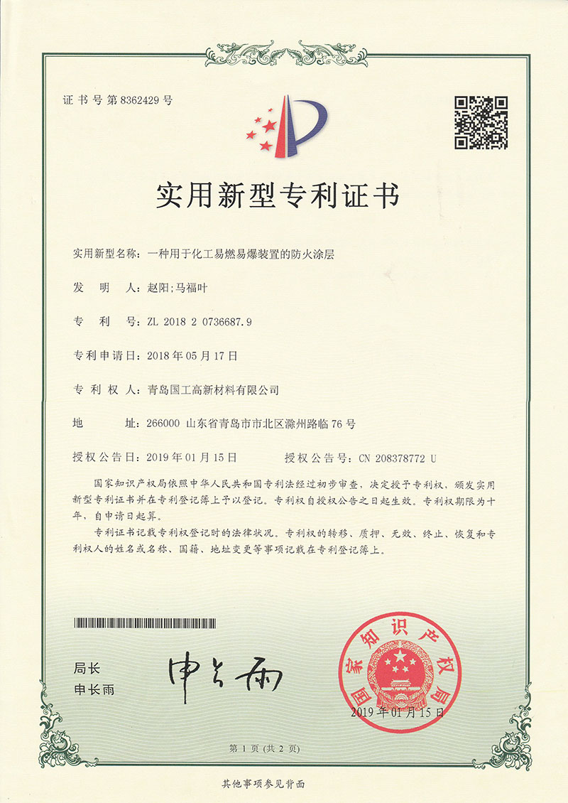 一種用于化工易燃易爆裝置的防火塗層 - 榮譽資質 - 青島湛江鑫本航空航天集团****